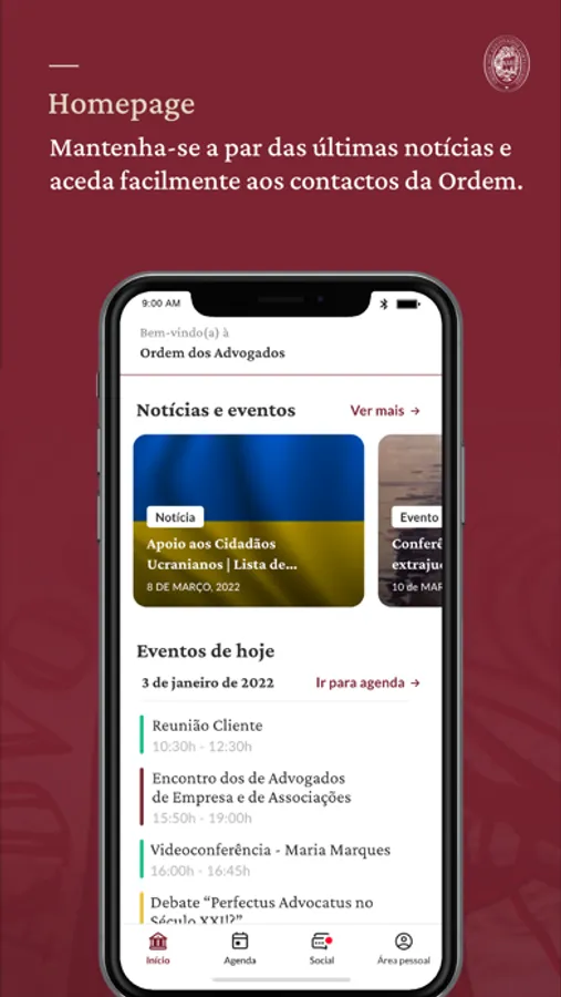 O Advogado pode ler na aplicação as notícias da Ordem e aceder a um calendário mensal com os eventos da OA tendo ainda a possibilidade de criar eventos pessoais nesse calendário.