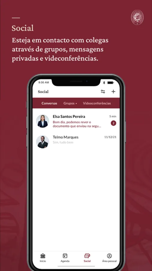 Na área social o Advogado pode trocar mensagens de texto com outros Advogados ou com grupos constituídos por Advogados, trocar ficheiros (imagens, vídeos, PDF) para/ de um Advogado; criar conversas de grupo.