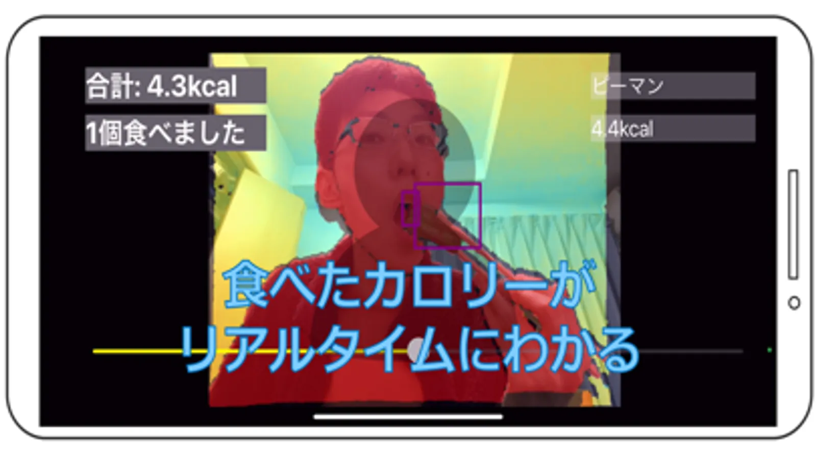 アプリを起動して食事する様子を自撮りするだけで、摂取したカロリー量を把握することができます。