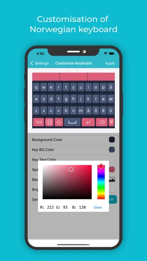 • Change colours for the Background colour, Key background colour, Keyboard text colour, Suggestion box colour etc, so that typing does not seem boring and monotonous with this Norwegian keyboard for iOS.