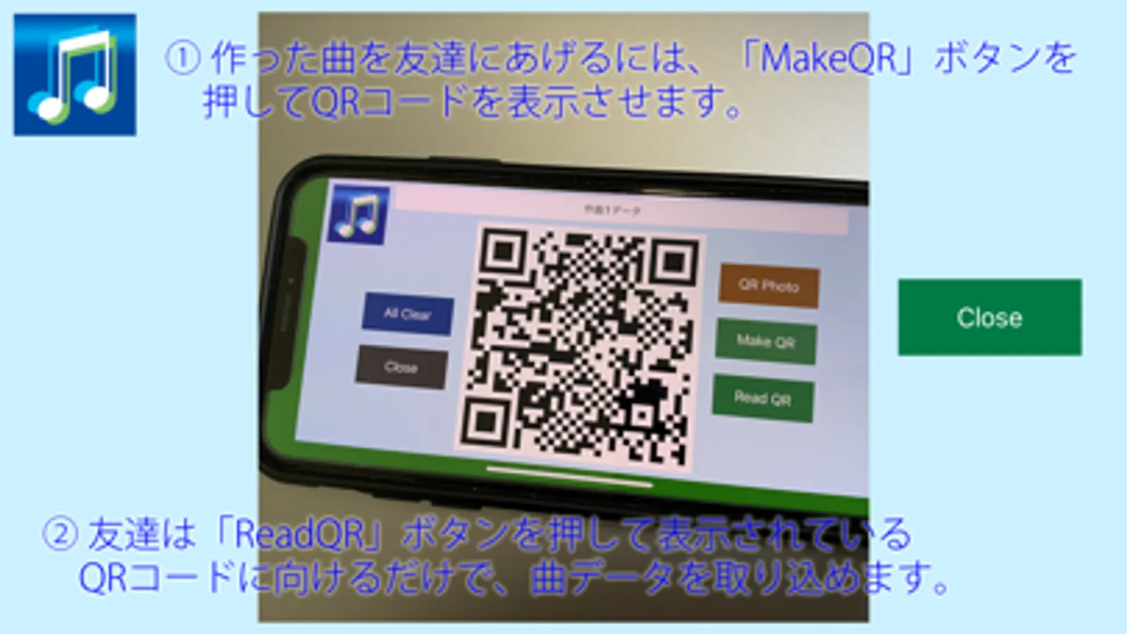 「MakeQR」ボタンを押すと、現在の曲データをQRコード変換して表示します。