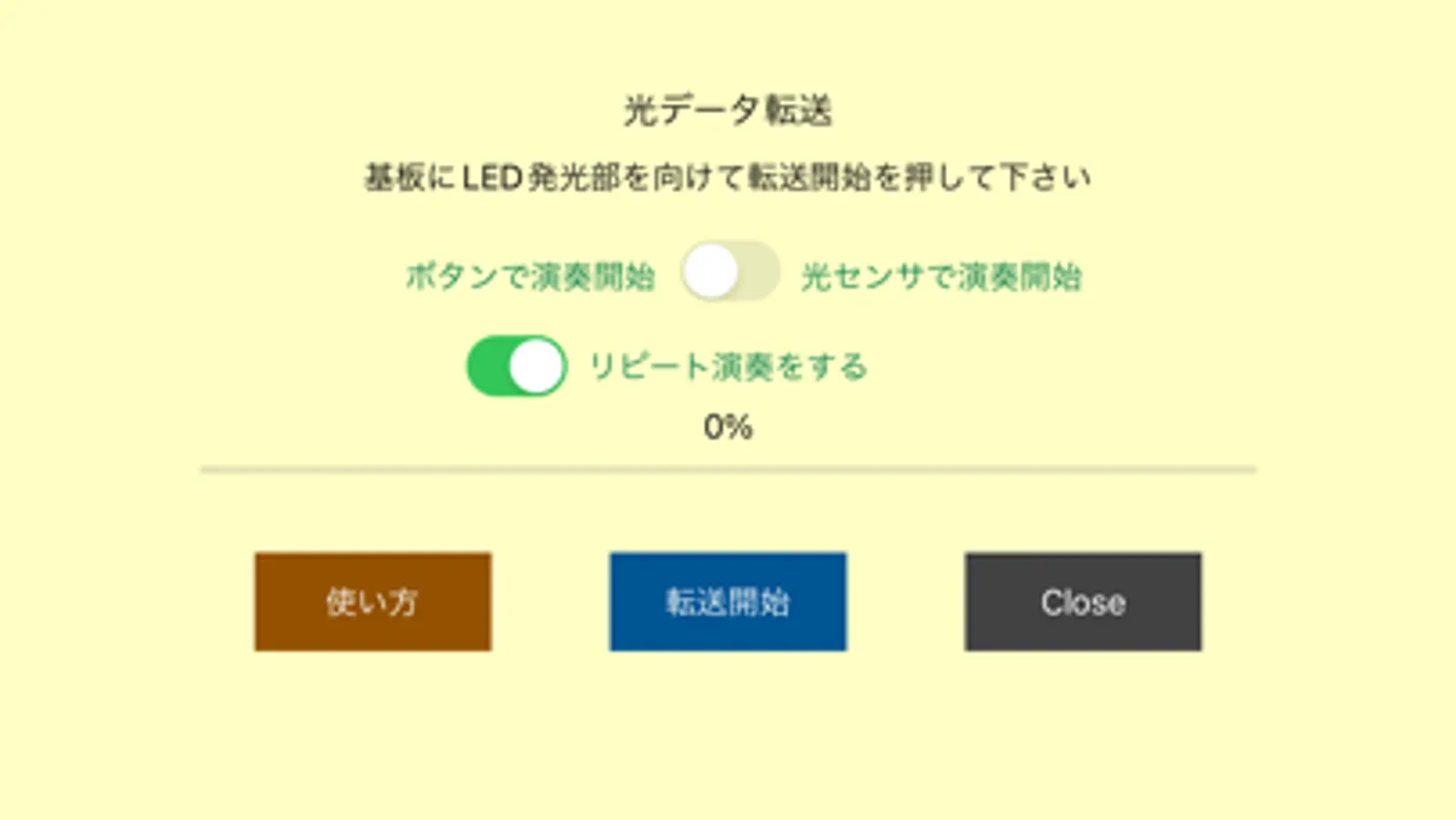スマホのカメラ用照明部分を基板の光センサの真上に来るように置き「転送開始」ボタンを押します。