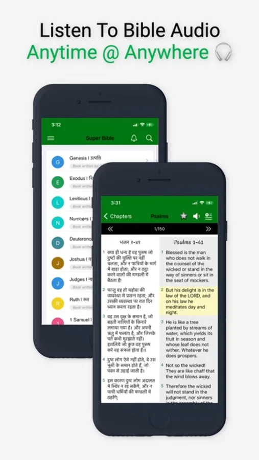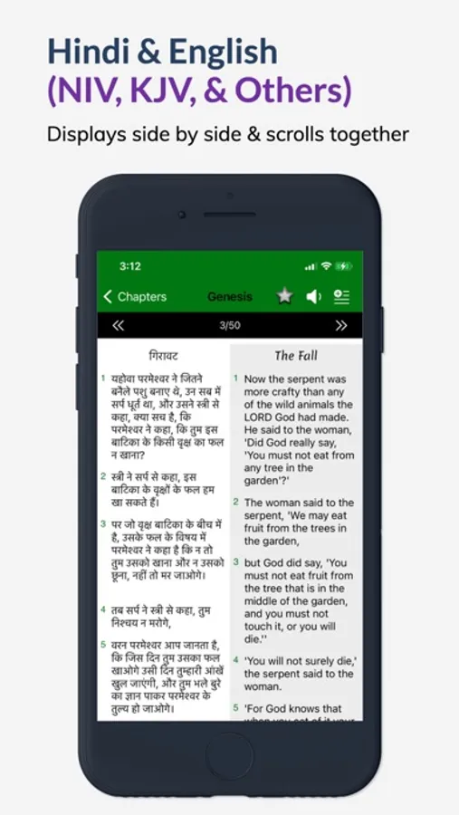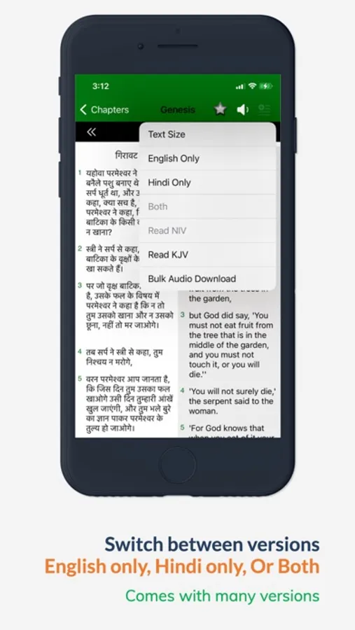 Install the full the Hindi and English Bible for both NIV & KJV right on your phone with stunning interface and beautiful animations. You can read both English and Hindi side by side and you can also switch between NIV & KJV for English. You can expand one side to view the full screen text.