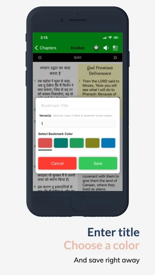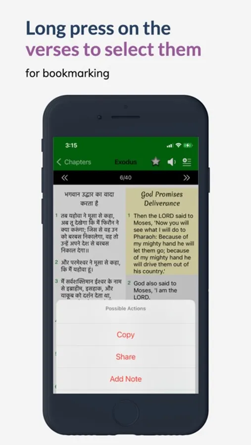 -- Bookmark option with nice features added to it. You can bookmark the whole chapter like Genesis:5, you can also bookmark specific verses like Luke 5:3-6 and Mathew:3:4,6,12.
