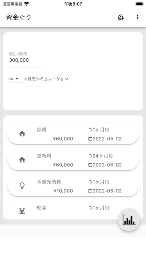 そのような固定収支をあらかじめ入力しておくことで、現在の残高をもとに将来の残高が把握できるアプリです。