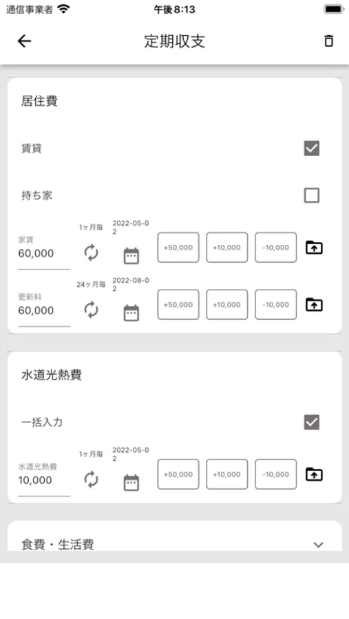 当アプリは一般的な固定収支をリストアップしているので、該当するものを入力していくことで、身の回りにある固定収支の網羅的入力をサポートしております。