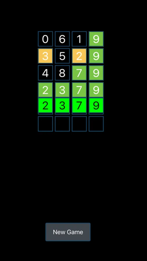 Guess a 4 digit number (with no repeating numbers). Color coded feedback of your number guesses helps you determine the secret number.