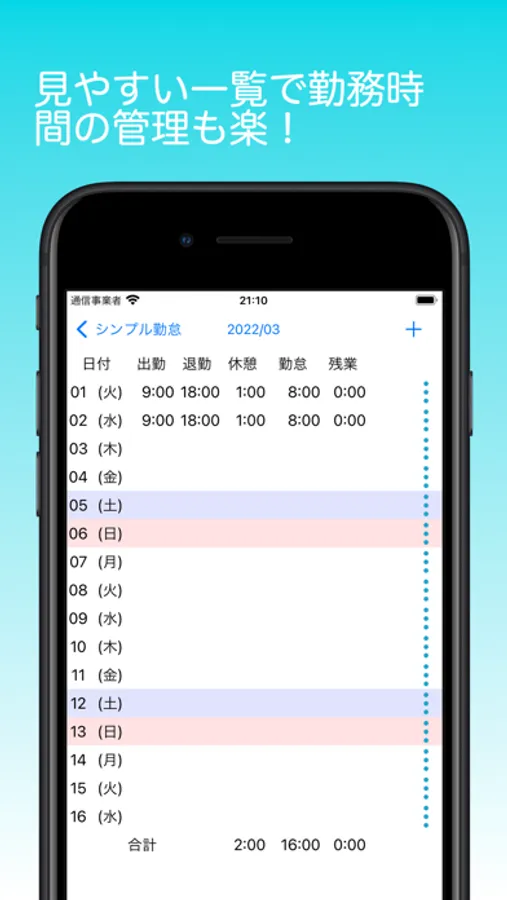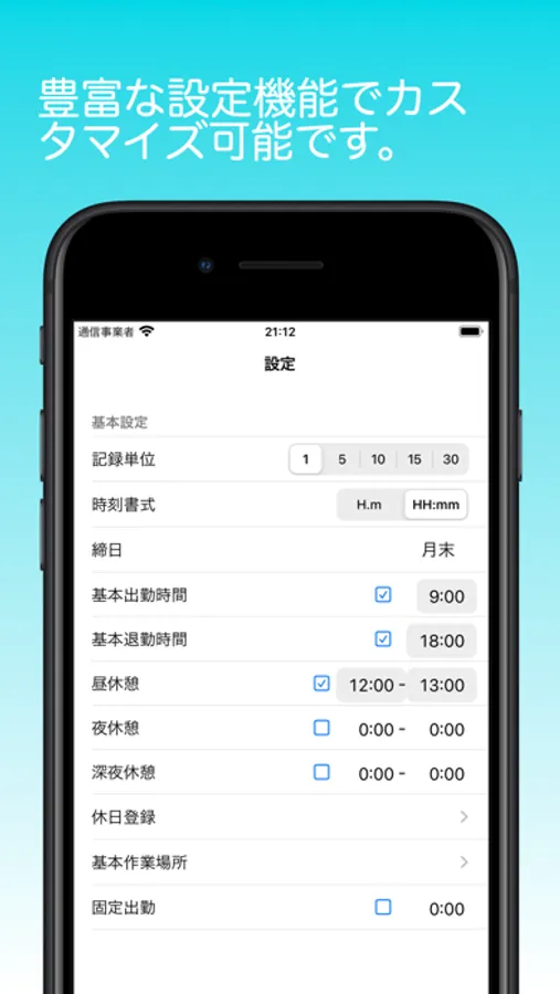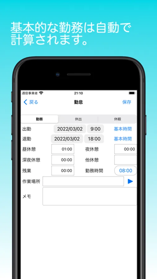 ・基本出退勤の時間と休憩時間を設定すると自動で勤怠時間、残業時間を計算します。
