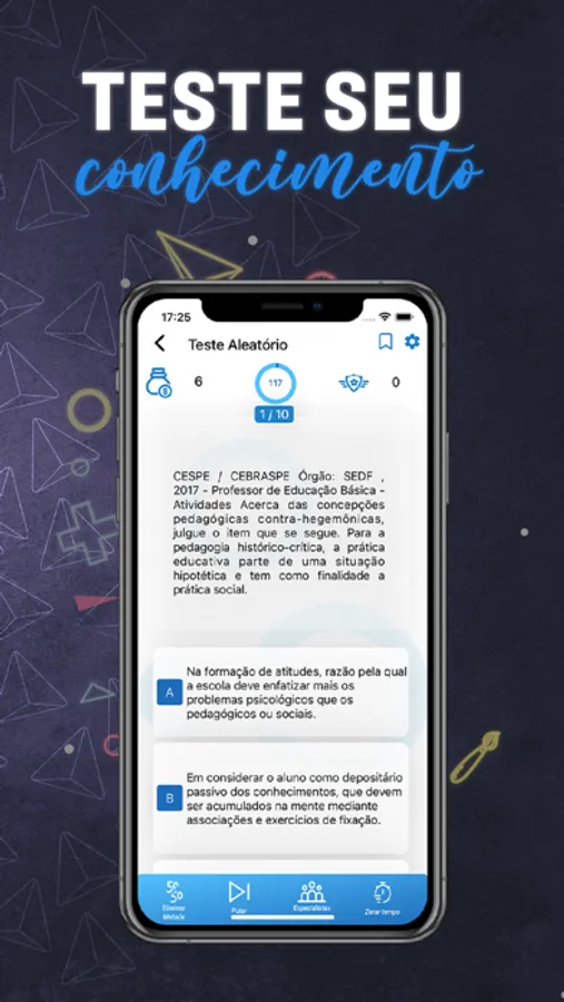 Esta é a modalidade ideal para refinar seus conhecimentos em vésperas de provas. Desafie-se em provas com temas específicos, onde você seleciona quantas questões quer responder e qual o tempo disponível.