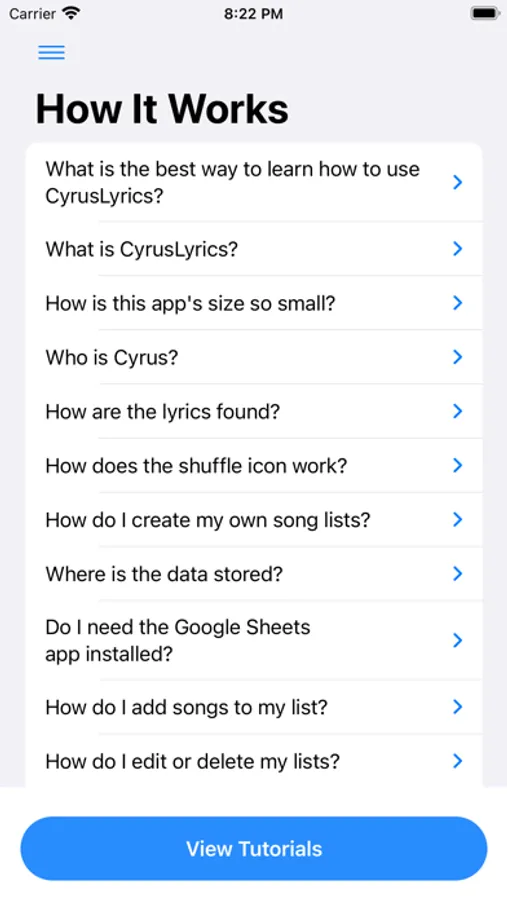 I thought "this is crazy; I probably know at least a hundred songs and probably most of the lyrics to those songs, so why can't I think of them?" That's why CyrusLyrics was born. I built the app for myself so that I could easily store and find the lyrics to the songs that I liked to sing to my son.