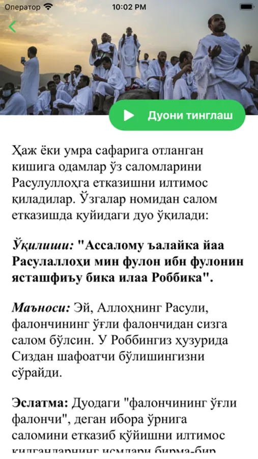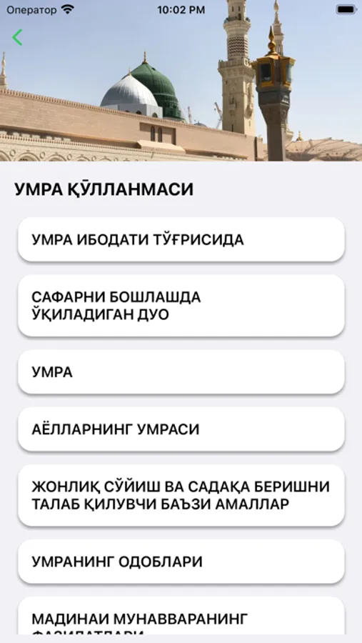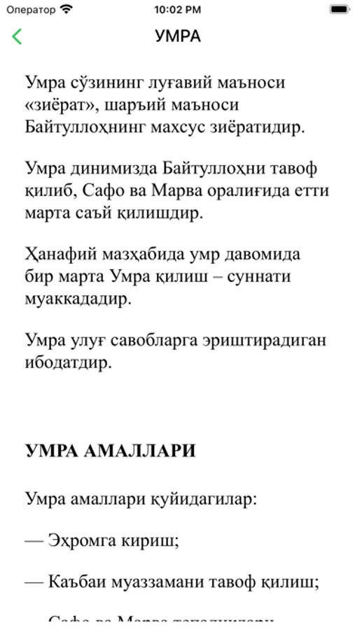 Есть разделы «Путеводитель по Умре», «Молитвы Умры», «Подготовка к паломничеству» и «Места по исламской истории».