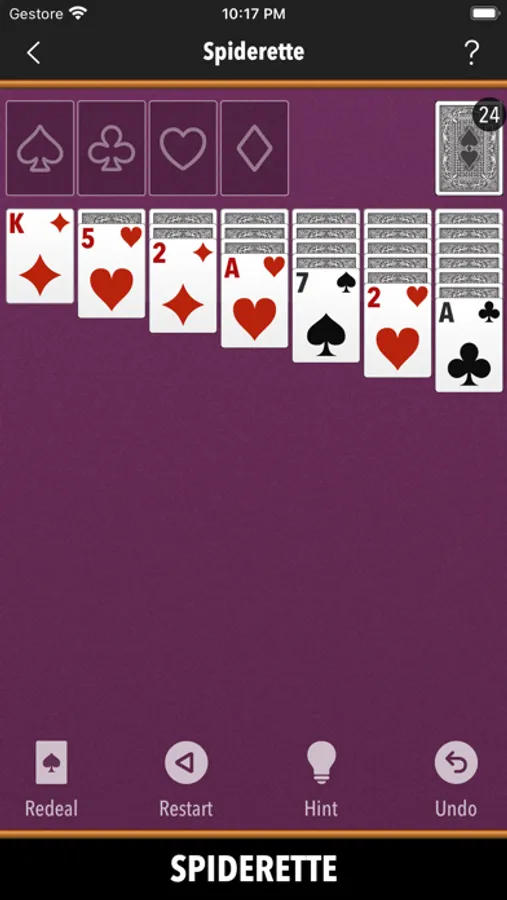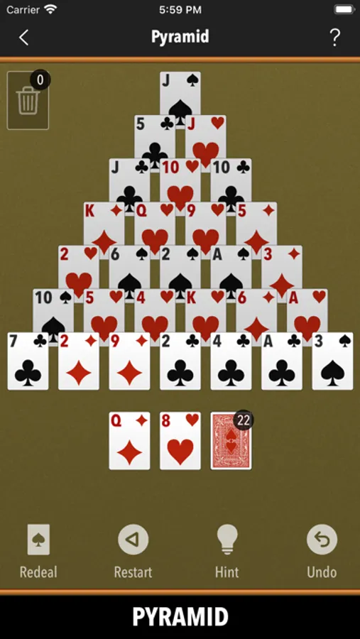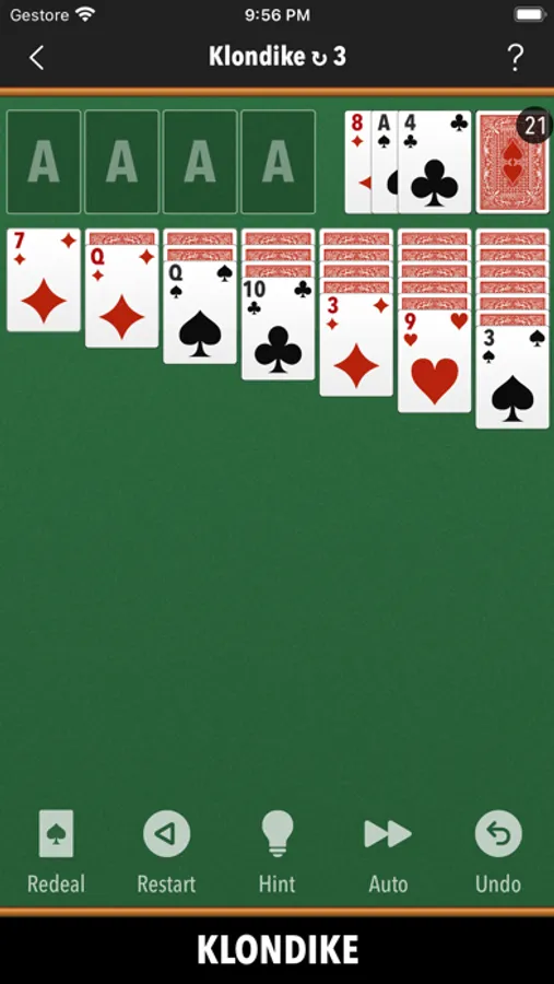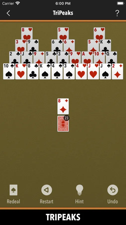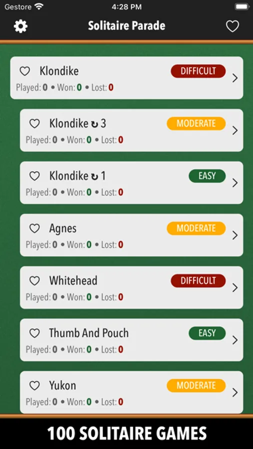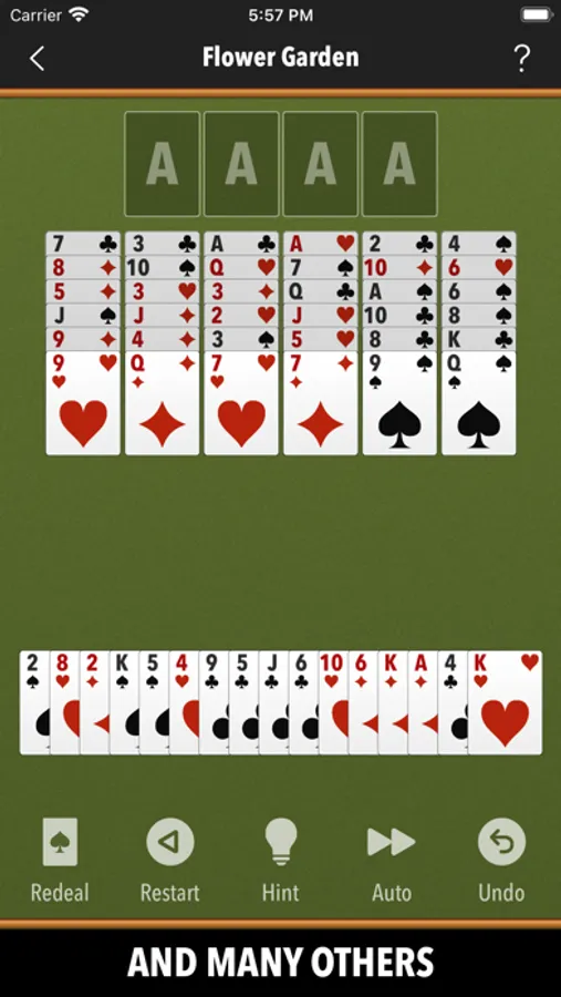 Klondike, Spider, Spiderette, Freecell, Pyramid, TriPeaks, Canfield, Agnes, Whitehead, Thumb And Pouch, Yukon, Thieves Of Egypt, Will O’ The Wisp, Easthaven, Rainbow, Storehouse, Superior Demon, Chameleon, King Albert, Flower Garden, Wildflower, Stonewall, Virginia Reel, Royal Parade, Four Seasons, Fortune's Flavor, Westcliff, Scorpion, Carpet, Double Or Quits, Quadrille, Nestor, Golf, Thirteens, Elevens, Fifteens, Tens, Baroness, Montecarlo, Aces Up, Calculation, Osmosis, Queen's Audience, Bristol, Eight Off, Strategy, Eighteens, Patriarchs, Contradance, Sultan Of Turkey, Duchess, Royal Cotillon, Colorado, Royal Rendezvous, Forty Thieves, Maria, Number Ten, Streets, Indian, Rank And File, Odd And Even, Windmill, Precedence, Mount Olympus, Frog, Fanny, Sly Fox, Matrimony, Miss Milligan, Busy Aces, Rouge Et Noir, Congress, Harp, Deuces, Square, Courtyard, Herringbone, Gargantua, Wasp, Three Blind Mice, Penguin, Seahaven Towers, Alhambra, Queen Of Italy, Blondes And Brunettes, Falling Star, Redheads, St. Helena, Box Kite, Louis, Capricieuse, Grand Duchess, Parisienne.