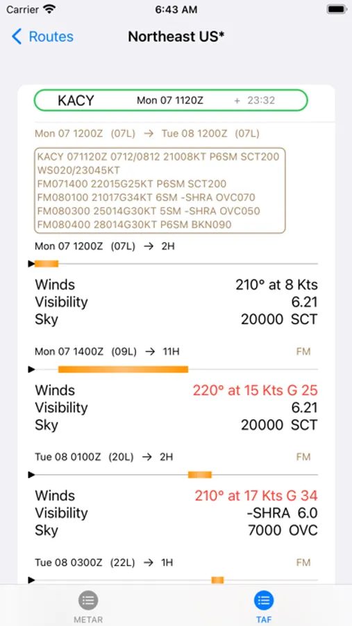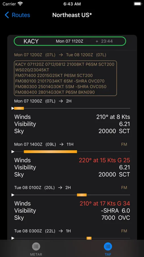 -- TAFs show an orange timeline for forecast periods (eg., FM).