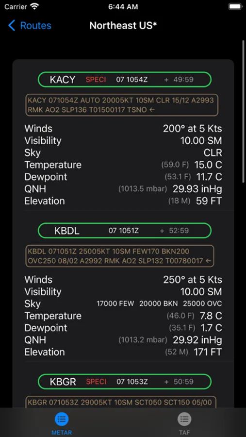 World Av Weather is designed from the ground up to be quick and easy to use. The user creates a list of routes using ICAO identifiers. The route can be local airports in the practice area or a special route with departure, destination, en route and alternate airports. Routes can be added, edited, deleted and reordered. When a route is selected from a list, the METARs and TAFs are displayed.