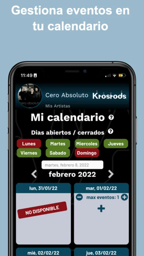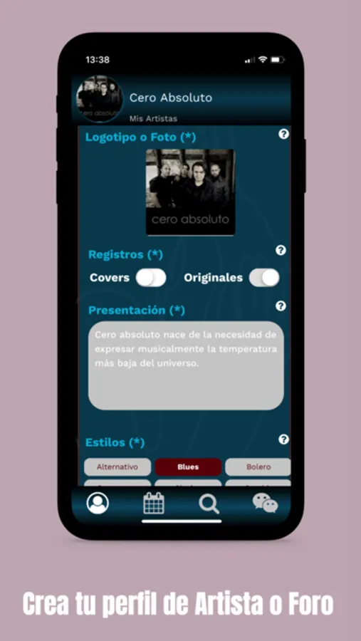 Creación de perfiles completos de Artistas y Foros (nombre, descripción, logotipo, fotos, videos, enlace a redes sociales)