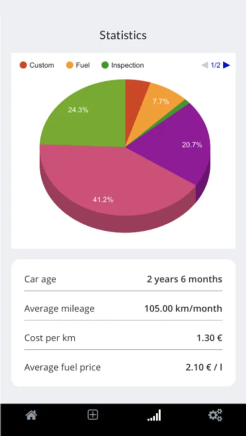 In the statistics view you can track the car age, average monthly mileage, cost per km/mile, and average fuel cost.