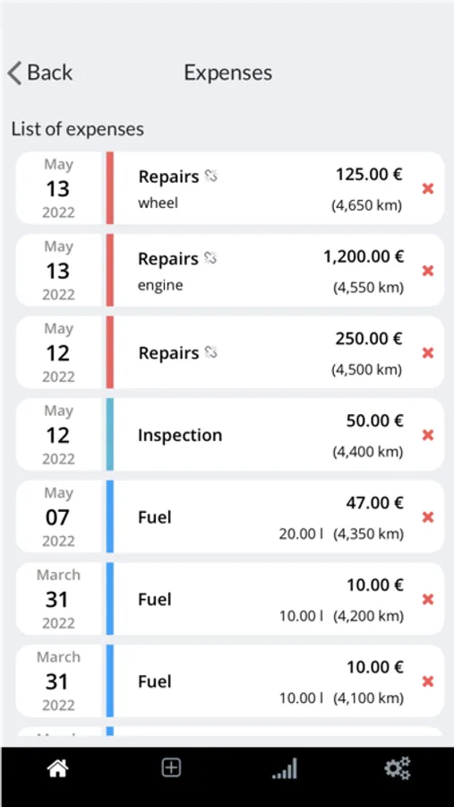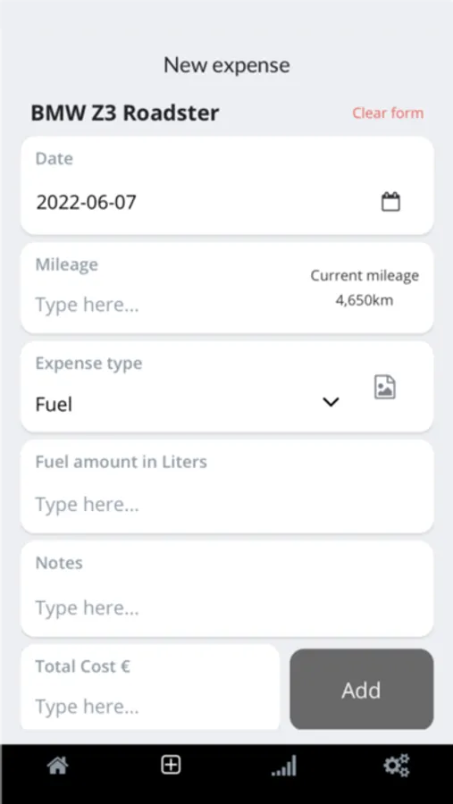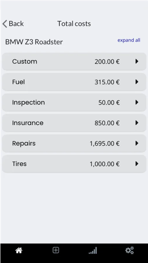 The app helps you to monitor and control multiple costs e.g. fuel, charging, tolls maintenance, improvements and any custom cost. For every cost you can add the bill/receipt photo.