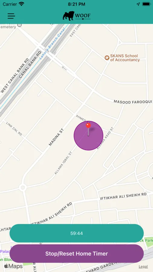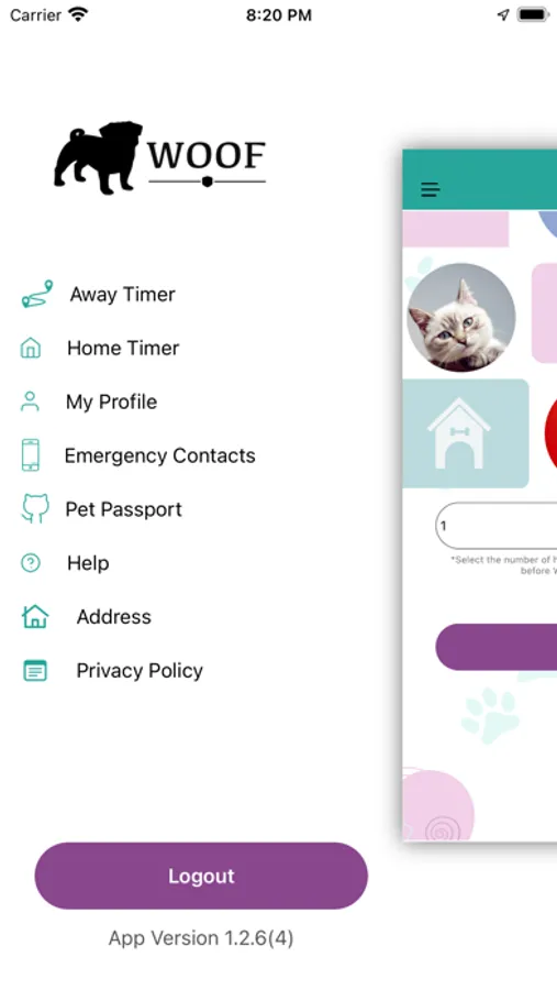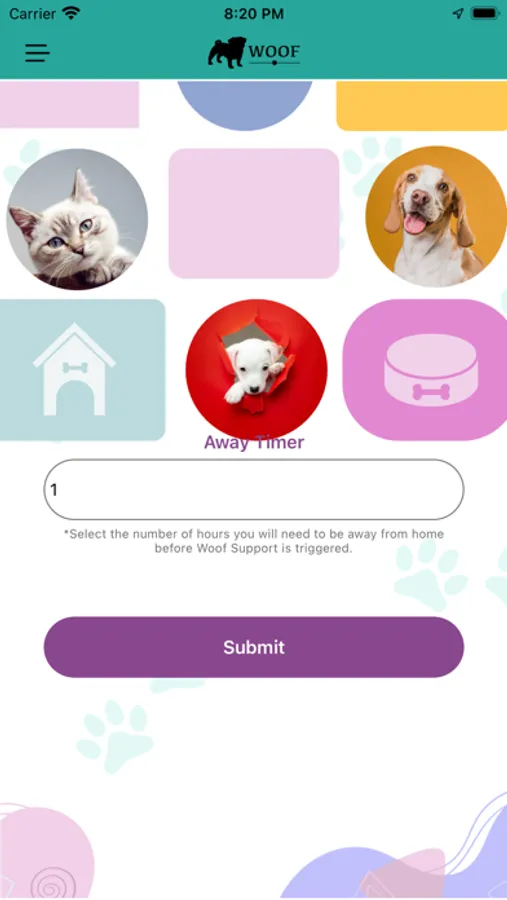 1) Geolocation Away Timer: A countdown timer linked to your home address that automatically starts when you leave home and stops when you return. You only need to set this timer 1 time and the app will remember your setting. If the timer ever expires that means that your pet’s wellbeing may be at risk, and Woof’s three-tiered support structure will be automatically triggered.