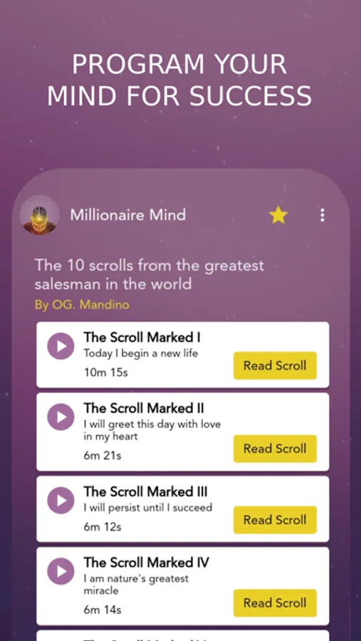 O. G Mandino’s “The Greatest Salesman in the World '' lays out timeless principles for personal success that have profoundly impacted millions of people around the world. Each scroll and positive affirmation in this app is specially worded to help you grasp the meaning behind the timeless principles. These scrolls are not for salespeople. They are for people who want to succeed in life. You will get re-energized to pursue your dreams everytime you listen to the audios or read scrolls again.