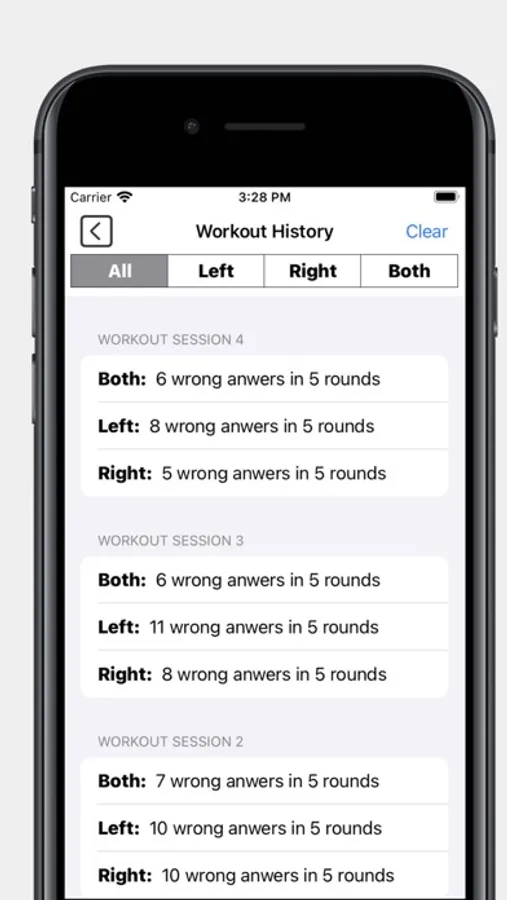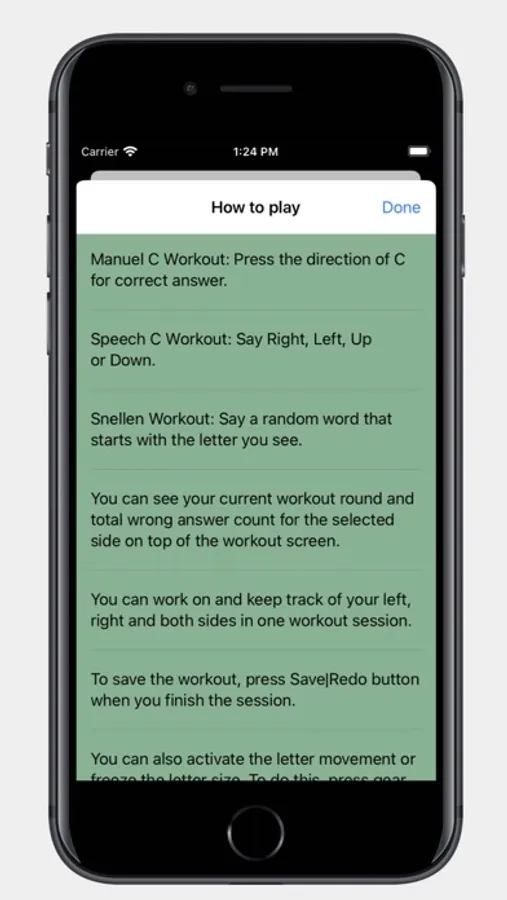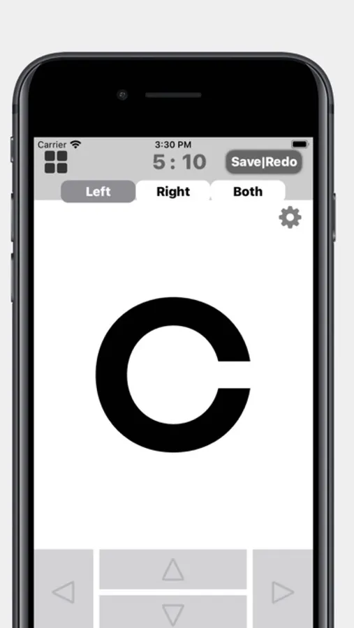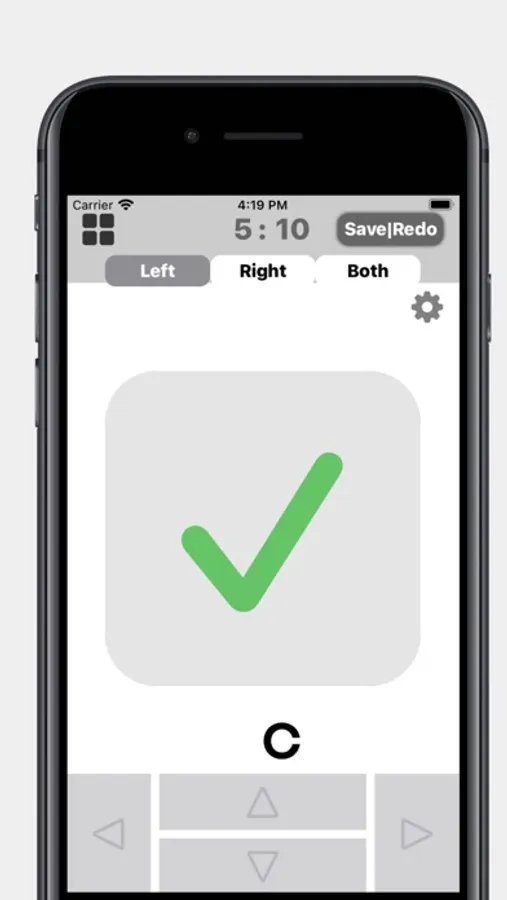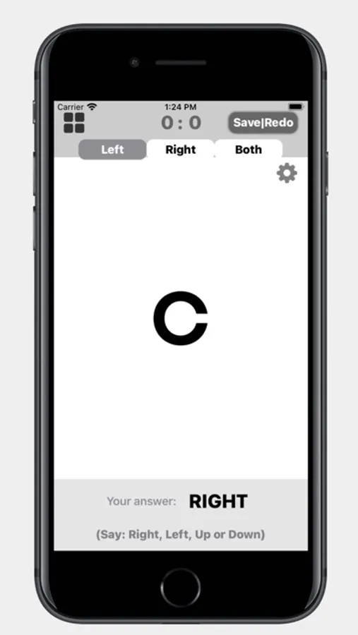 In Speech Mode or in Snellen Workout: You don't have to hold your phone. Say the letter direction(C Workout) or a random word that starts with the letter you see on the screen(Snellen Workout). After each correct answer, the letter on the screen will get smaller.