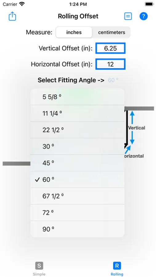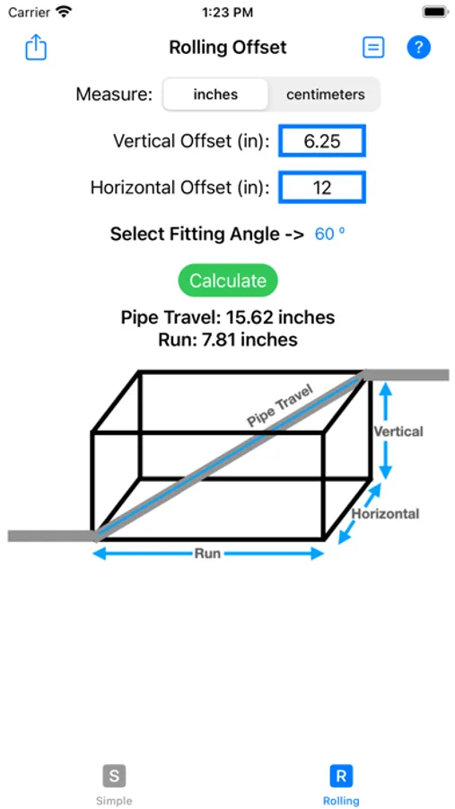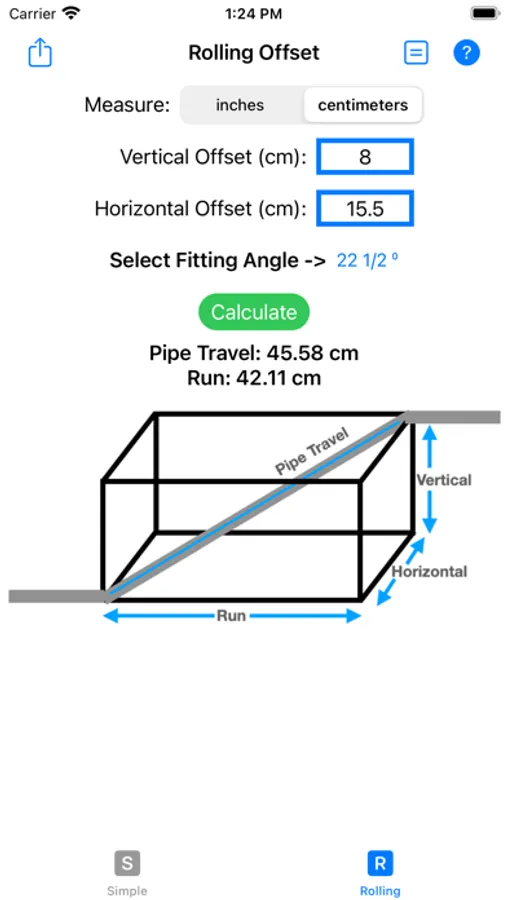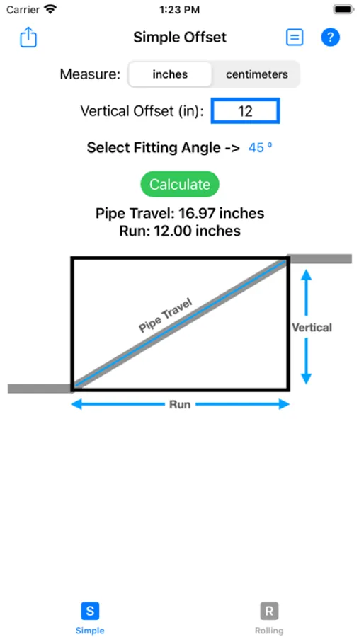 When running pipes or conduits, it is common to have to change the run of the line of pipes by using two equal angled elbow fittings. This App will save both material and time using a quick and simple way to perform calculations.