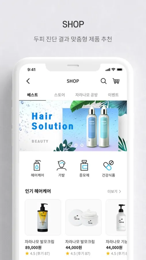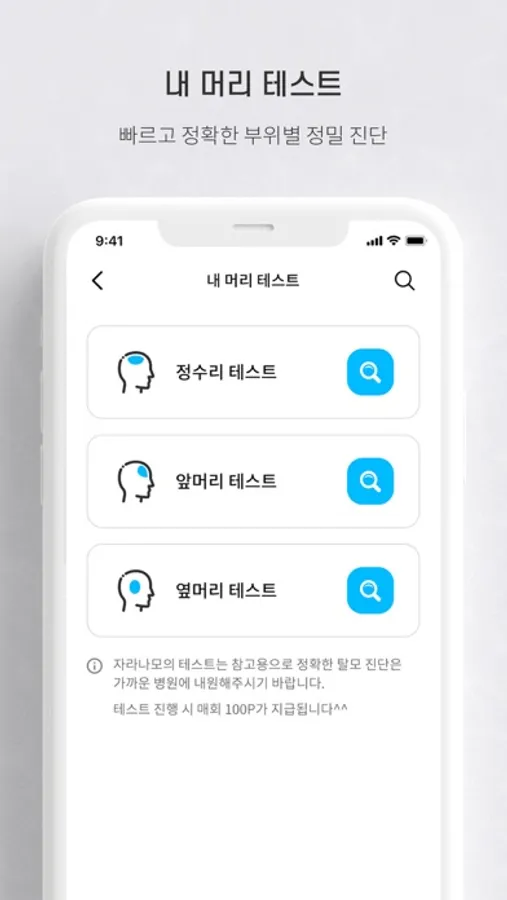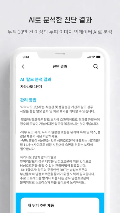결과에 따라 맞춤형 제품 추천, 인근 병원 및 헤어숍 소개, 유저 커뮤니티와 이벤트 등 탈모 케어에 필요한 서비스를 고객에게 원스톱 통합 서비스를 제공합니다.
