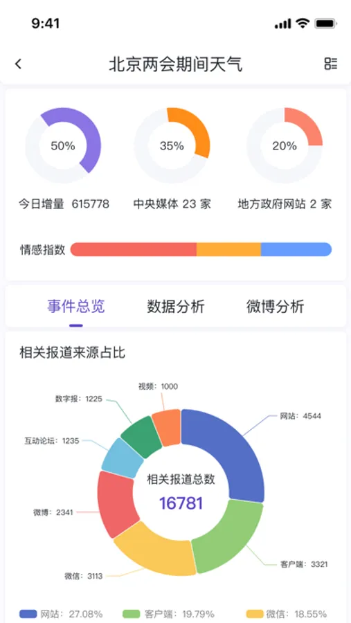 3.事件分析:实现对突发事件的监测、追踪和溯源,对事件进行全貌解析;通过多维度的分析结果,可清晰掌握事件相关数据及发展趋势。
