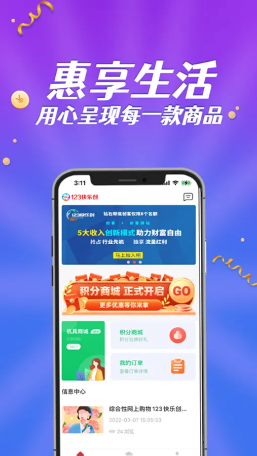 123快乐创--是芝麻传奇科技有限公司最新推出的创客App,是一家专业的多元化的大众服务平台。创新启动聚合创客+孵化创客驿站的传帮带教123快乐创运营模式,更简单更容易更高能。123快乐创将充分发挥公司的智能技术优势,用科技为更多人提供值得信赖的服务,打造中国最具幸福感的服务平台。