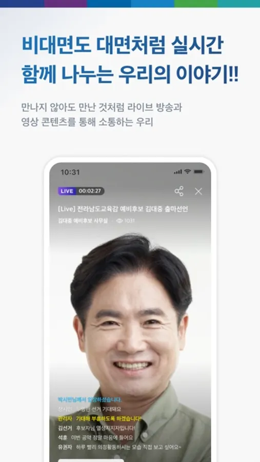 # 실시간으로 김대중 후보와 라이브로 만날 수 있습니다.