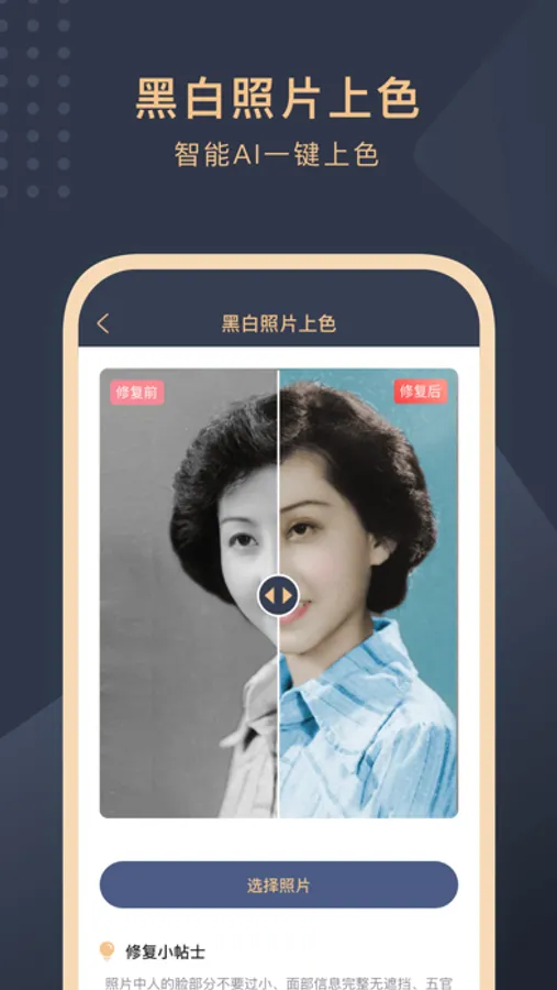 旧照片还原助手是专门针对,老旧照片修复的一款APP,为50、60、70、80后面提供照片修复,黑白上色等智能AI服务。为老一辈用户找回当年的色彩。