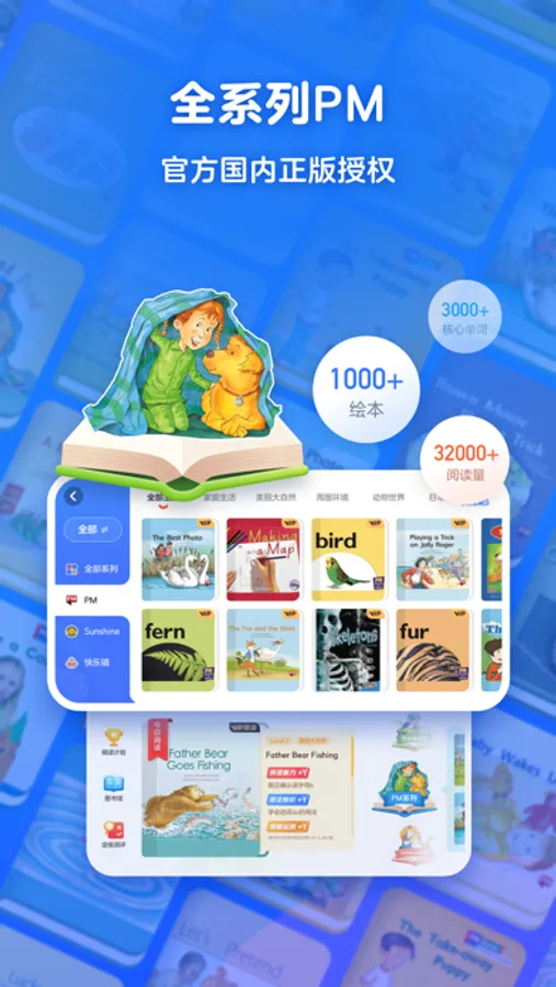 海量原版——1000+《PM 彩虹英语分级阅读》原版绘本无限畅读,涵盖多元文化。在同一语言难度体系下兼顾虚构和非虚构,科学配比6:4,兼具趣味性和科普性,帮助孩子建立阅读自信。
