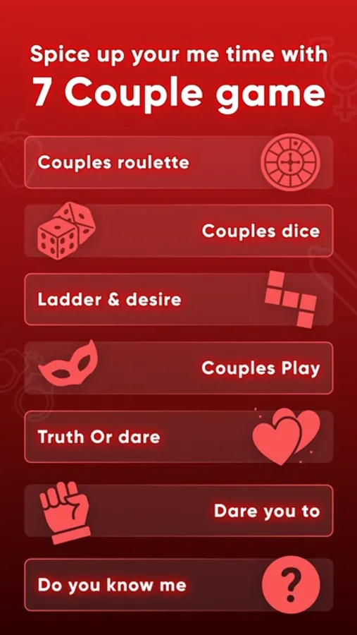 We2 is a suite of 7 sexy couple games to take your relationship to the next level. Play games like Sex Roulette, Sexy Dice, Ladder of Desire, Roleplay, Truth or Dare, Never Have I Ever, and Dirty Dare, and Do you know me (quiz). All of them have tasks/questions/actions related to couples, perform them and spice up your relationship or date night.