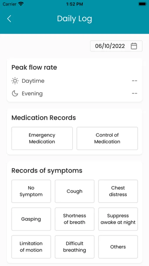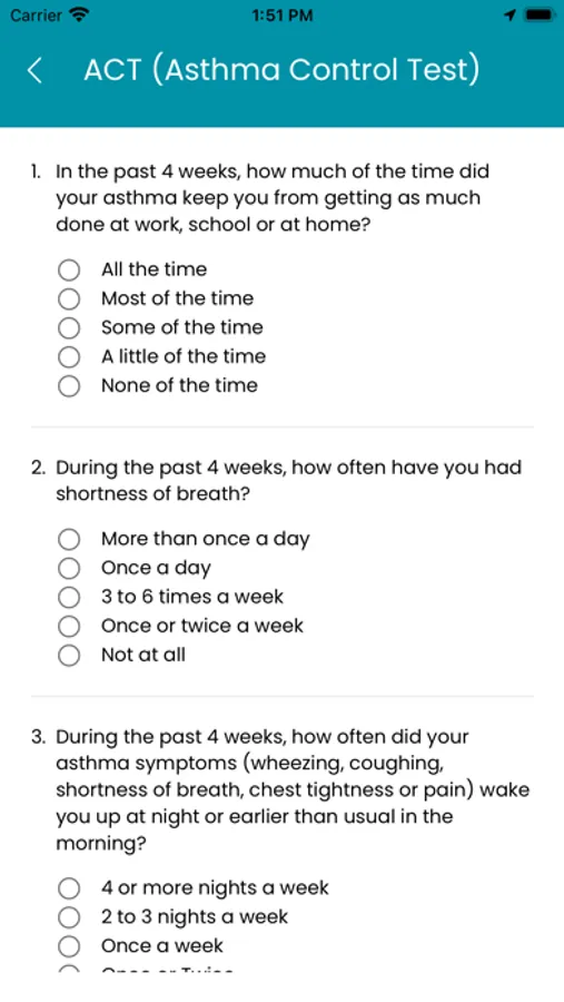 Assessments (ACT or CAT) are available in the App according to the user. Additionally, the in-app log makes it easy for users to track the medications being taken and any symptoms experienced for future reference.