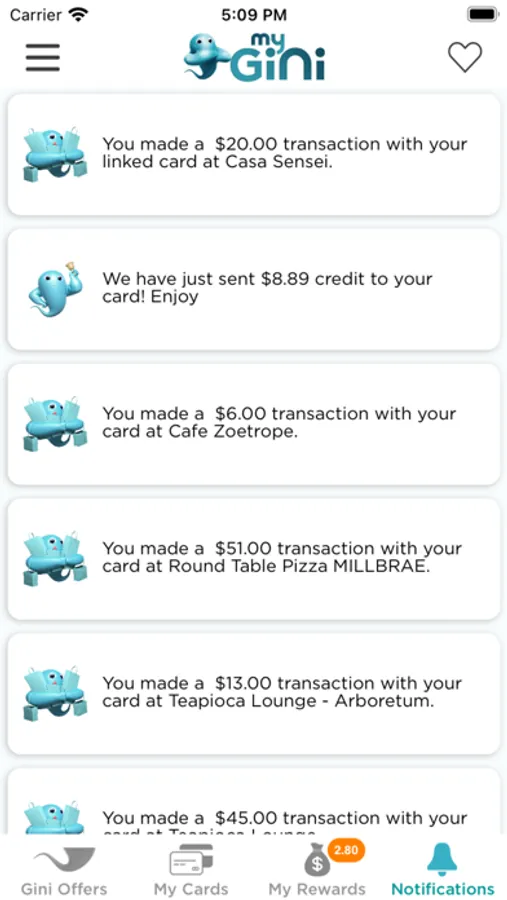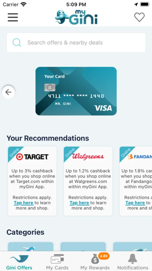 myGini is a loyalty and rewards platform that provides cash back and discounts at local and nationwide merchants, all for free. The app will show the offers within your 20-mile radius automatically.