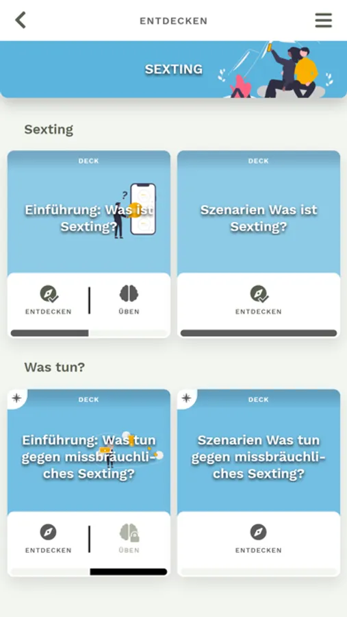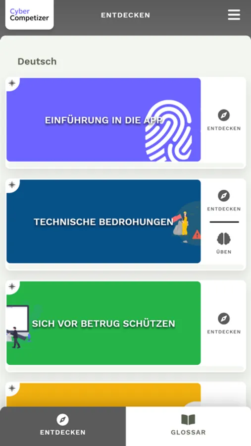 Bei jedem der fünf Themen erhältst du unter “Entdecken” zunächst eine Einführung, die dir einen thematischen Überblick bietet. Das darin Gelernte kannst du anschliessend mit «Üben» vertiefen. Am Schluss jeder Übung siehst du deinen Lernerfolg grafisch dargestellt. Möchtest du dich weiter verbessern, so sortiert ein Algorithmus die Fragen neu. Vorher falsch beantwortete Fragen werden nun mit neuen Fragen gemischt und erscheinen in anderer Reihenfolge. Du entscheidest selber, wann du ein Thema abschliesst und ein neues beginnst.