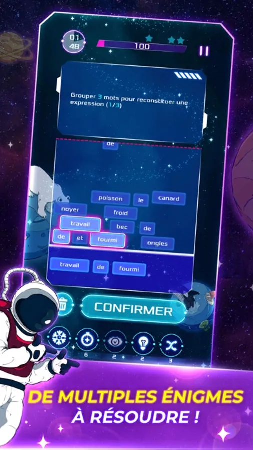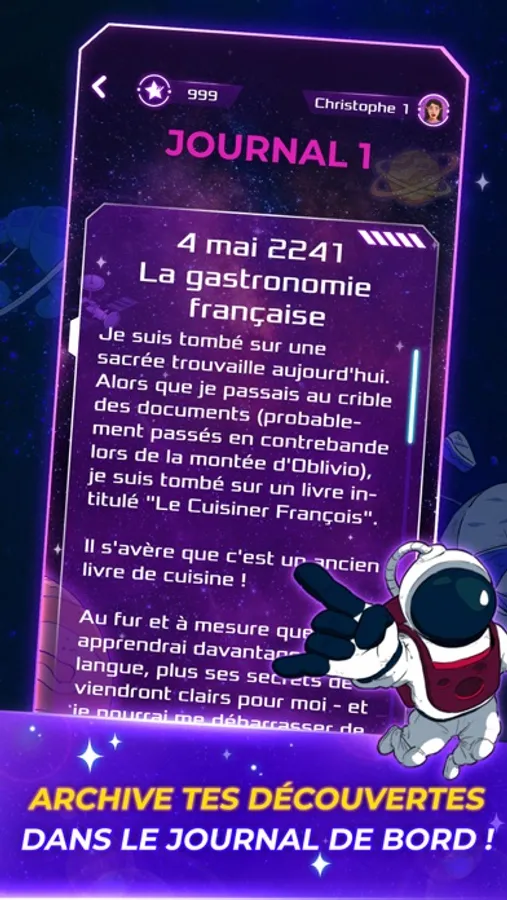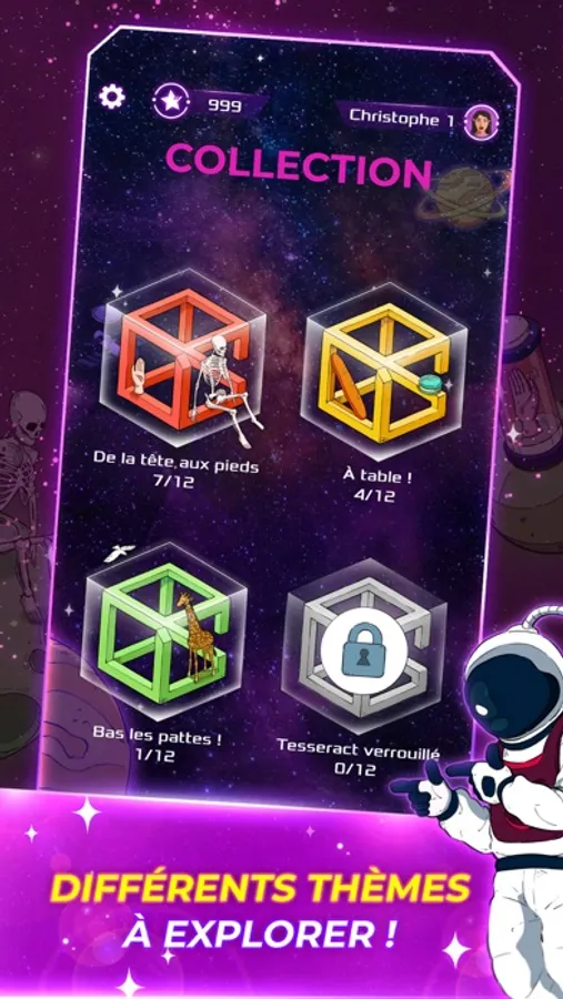 Remportez les défis ludiques dans des jeux d’associations ou trivia, quiz, jeux de cubes, mots croisés, mots cachés, puzzles ou casse-têtes, débloquez les tesseracts et collectionnez des cartes de récompenses sous forme de pages du journal de mission nécessaires à la progression de l’histoire et de l’aventure du spationaute Élocus dans la galaxie.