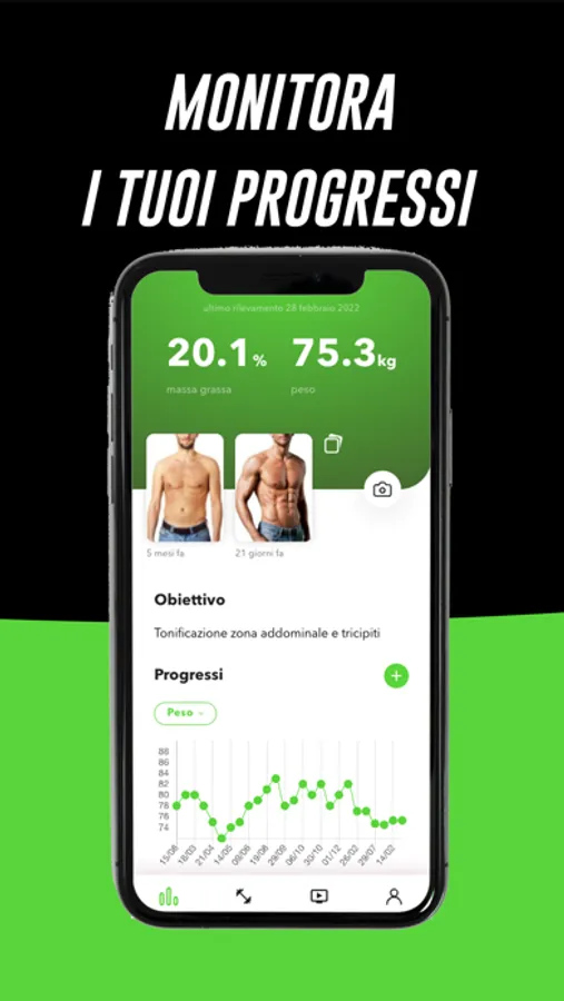 Avrai sempre sotto controllo la tua attività fisica: potrai visualizzare quali esercizi sono previsti nel tuo piano di allenamento, i tuoi progressi e come cambia il tuo fisico nel corso del tempo.
