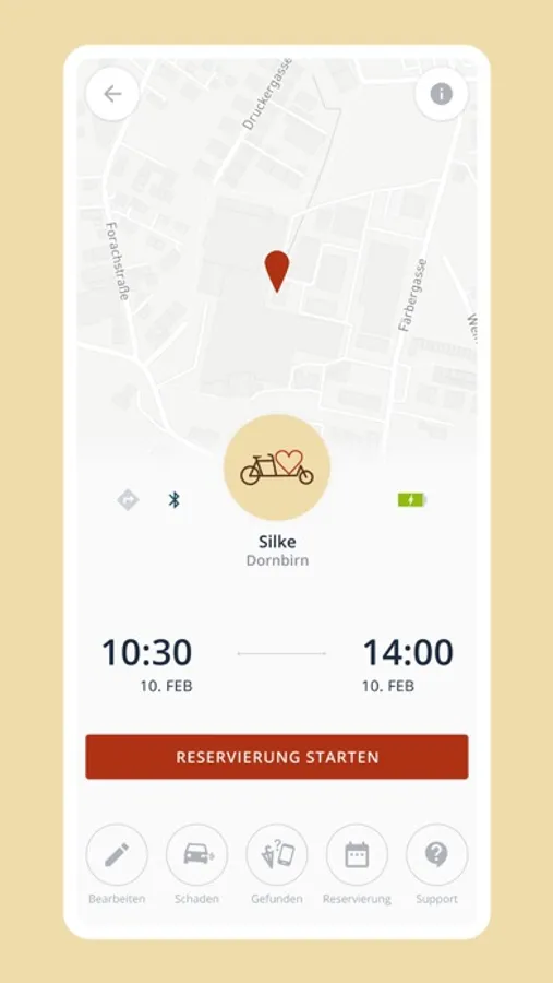 Wähle ein Rad aus der Liste oder Karte, dass am gewünschten Standort liegt und reserviere es für den gewünschten Zeitraum.