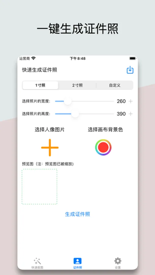 第三,制作一张证件照,也许比你想象的还要简单,你只需要将颜色设定为你想要的背景色,就可以快速生成一张设定好尺寸的证件照。