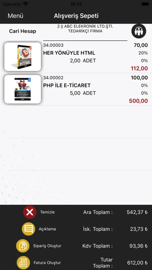KOBİERP Alışveriş Sepet ile müşterimizin istediği ürünleri ekledikten sonra miktar, iskonto ve birim fiyatı değiştirebilir veya ürün silebilebilir. Mutabakat sağlandıktan sonra sepet içeriği Sipariş veya Fatura olarak hızlı bir şekilde kaydedebilirsiniz.İstenildiği taktirde Bluetooth yazıcı ile çıktı alınabilir.