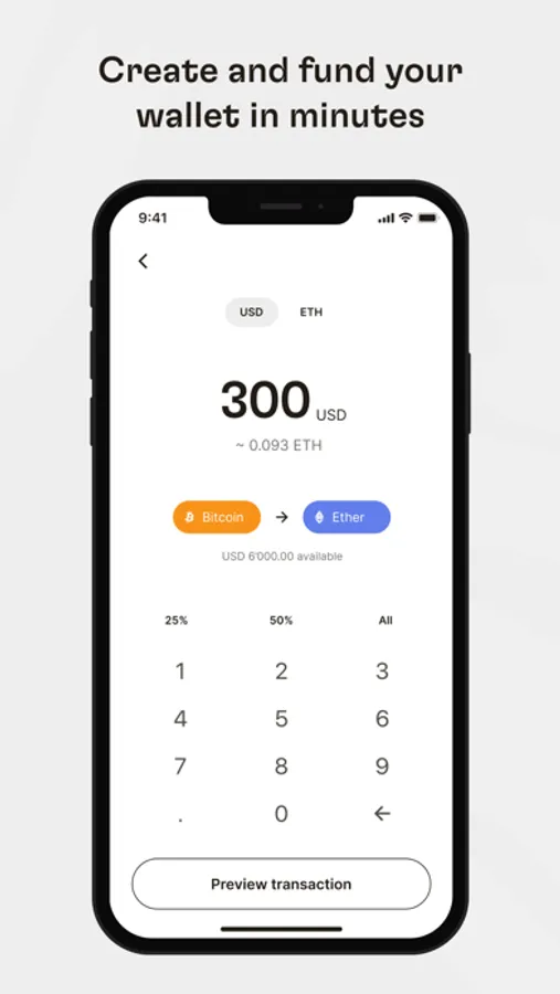 You can create your account in two steps and fund it directly with your credit card. Earn interest, diversify your portfolio or connect to Web3 dApps (e.g. Opensea) with one single click.