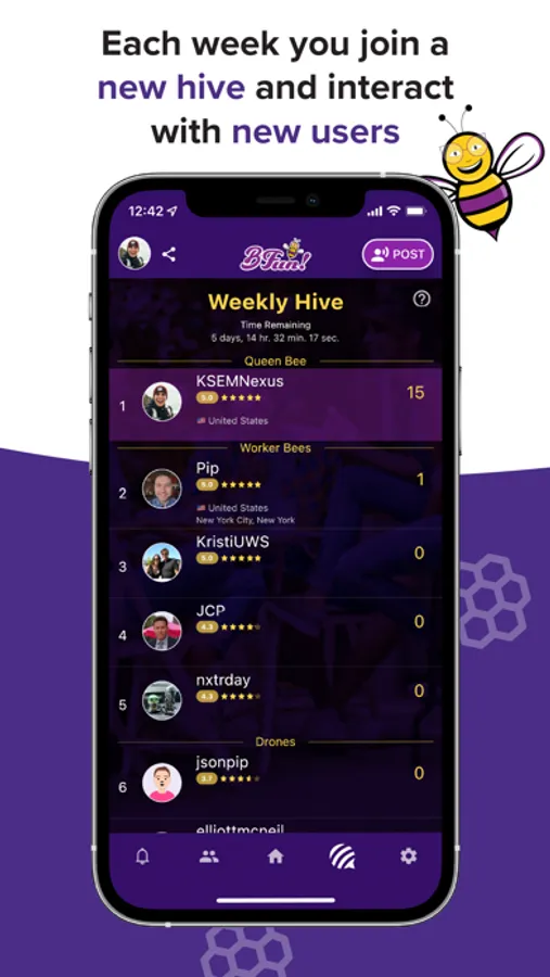Each week you'll compete with others to become Queen Bee of the Hive to increase your user rating and earn points and crowns for your contributions. Each week you're assigned to a Hive where you engage in friendly competition with others to become Queen Bee and increase your user rating. And the best part is, everyone receives a mutual benefit - whether you’re the Queen Bee who found the spot or subject, or a user who gets to hear about something or somewhere new!
