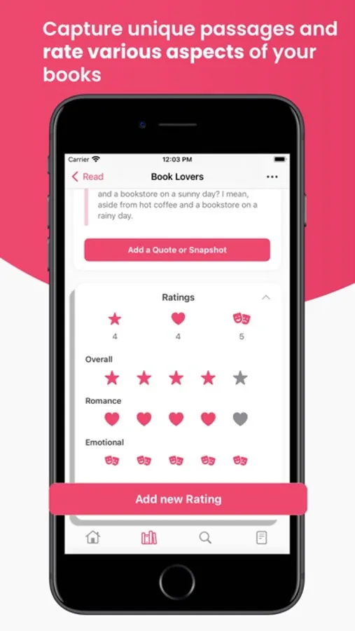 - Ratings to judge the book's plot, characters, writing style, and more.