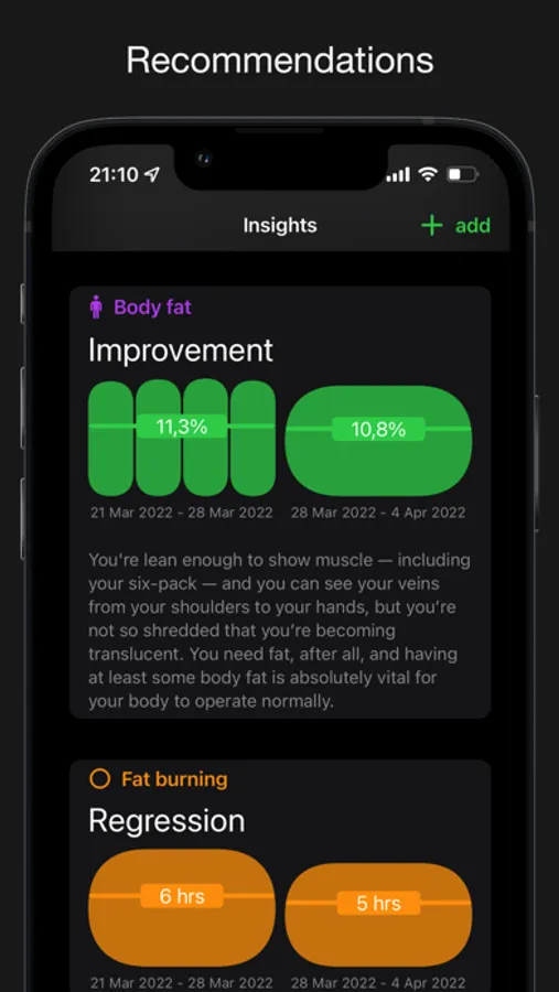 A powerful insight analyzer allows you to understand how different fasting stages improve your health and reduce body fat. Blood sugar analysis helps you understand how your insulin sensitivity changes during fasting intervals. FastBot provides an intelligent recommendations system that gives you hints on reducing weight and body fat.