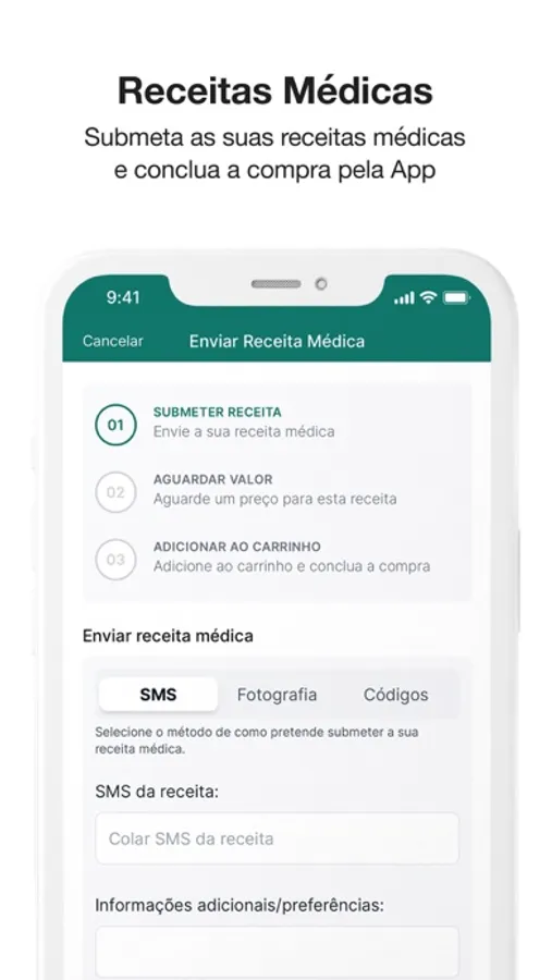 • Aviar as suas receitas médicas de forma simples e eficaz;