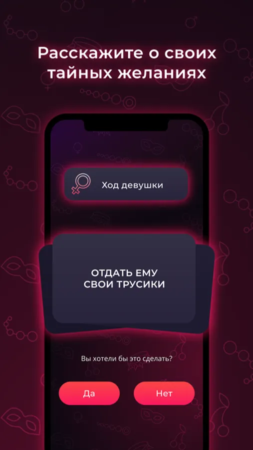 Сядьте вместе со своим партнером и поочередно ответьте на вопросы нашей секс игры о самых тайных желания. Придумывать ничего не нужно. Разработчики уже все придумали за вас. Просто выберите – хотите вы то, что написано на экране, или нет. Игра определит какие тайные желания совпадают у вас с вашим партнером.