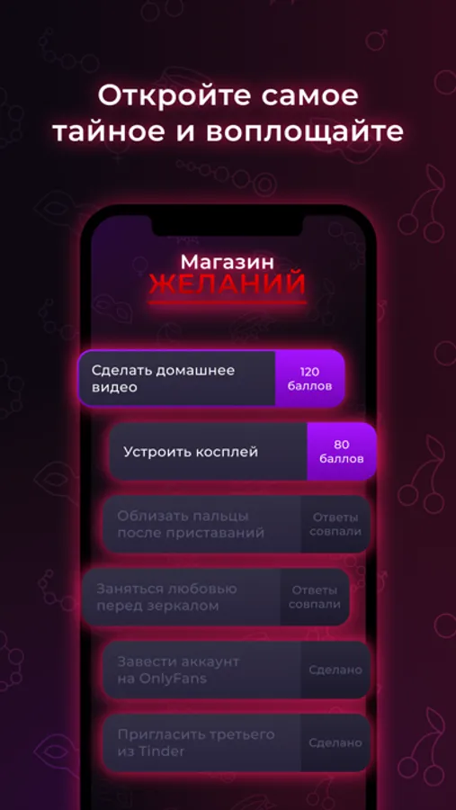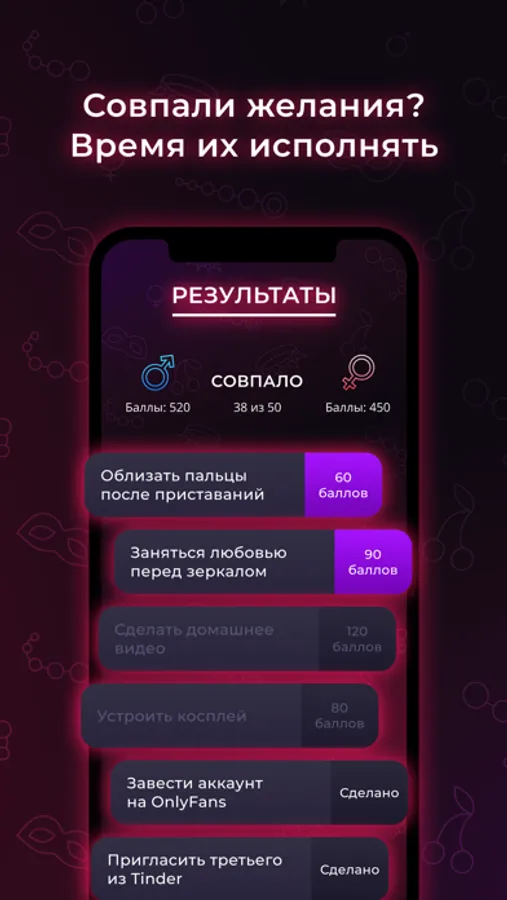 Исполняйте свои совпавшие желания, зарабатывая дополнительные баллы в игре. Их вы сможете потратить на те желания, которые не совпали, и воплотить их в жизнь. Интересное время, наполненное романтикой и новых впечатлений гарантировано для вас и вашей пары.