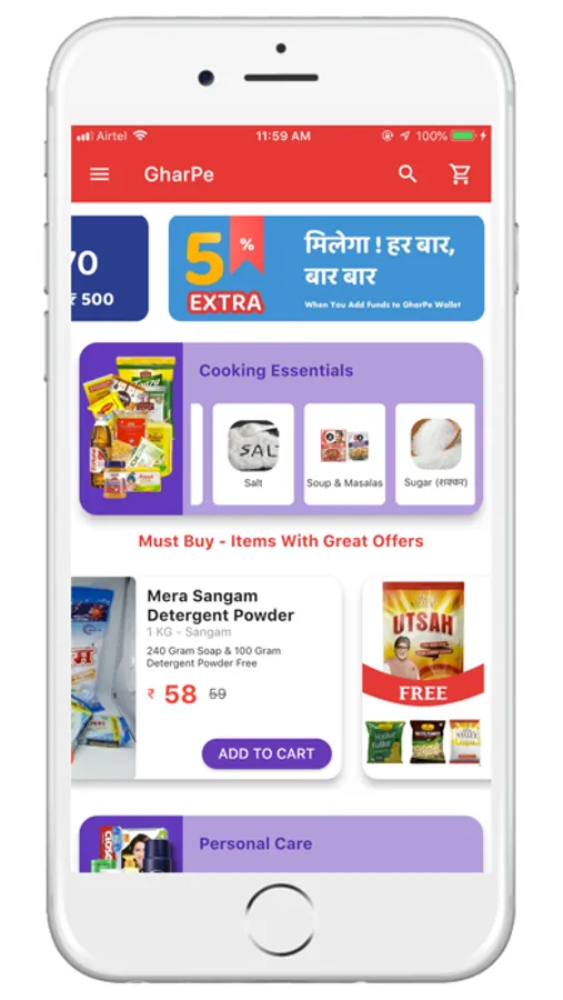 GharPe - Get Grocery, Food, Stationary or Anything else that we list to Ghar Pe. GharPe is your local grocery shop that delivers your purchases in no time. we commit to deliver goods in less than an hour.