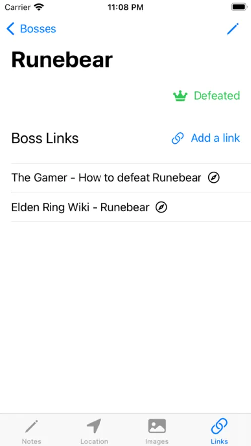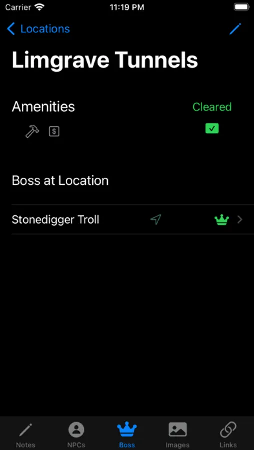 But locations and quests aren't tied to NPCs alone! Enter quests you stumble across as you explore large, open-world video games. Or enter locations into the app when you discover new points of interest, and store details to remind you to come back later, such as the presence of a helpful merchant or a note that you didn't clear so you can come back later to see if there's any good loot. And don't forget to track your bosses - keep track of how many bosses you've defeated, and use the undefeated boss list as a reminder to come back and revisit the tougher bosses when you've leveled up or have better gear. Use boss notes to save dropped items, or save links to boss fight walkthroughs to help you figure how to beat them.