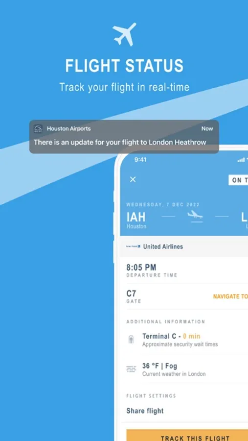 Houston Airports’ official mobile app easily helps you find your way straight to your gate or any point along the way at IAH and HOU with these stress-reducing and time-saving features: